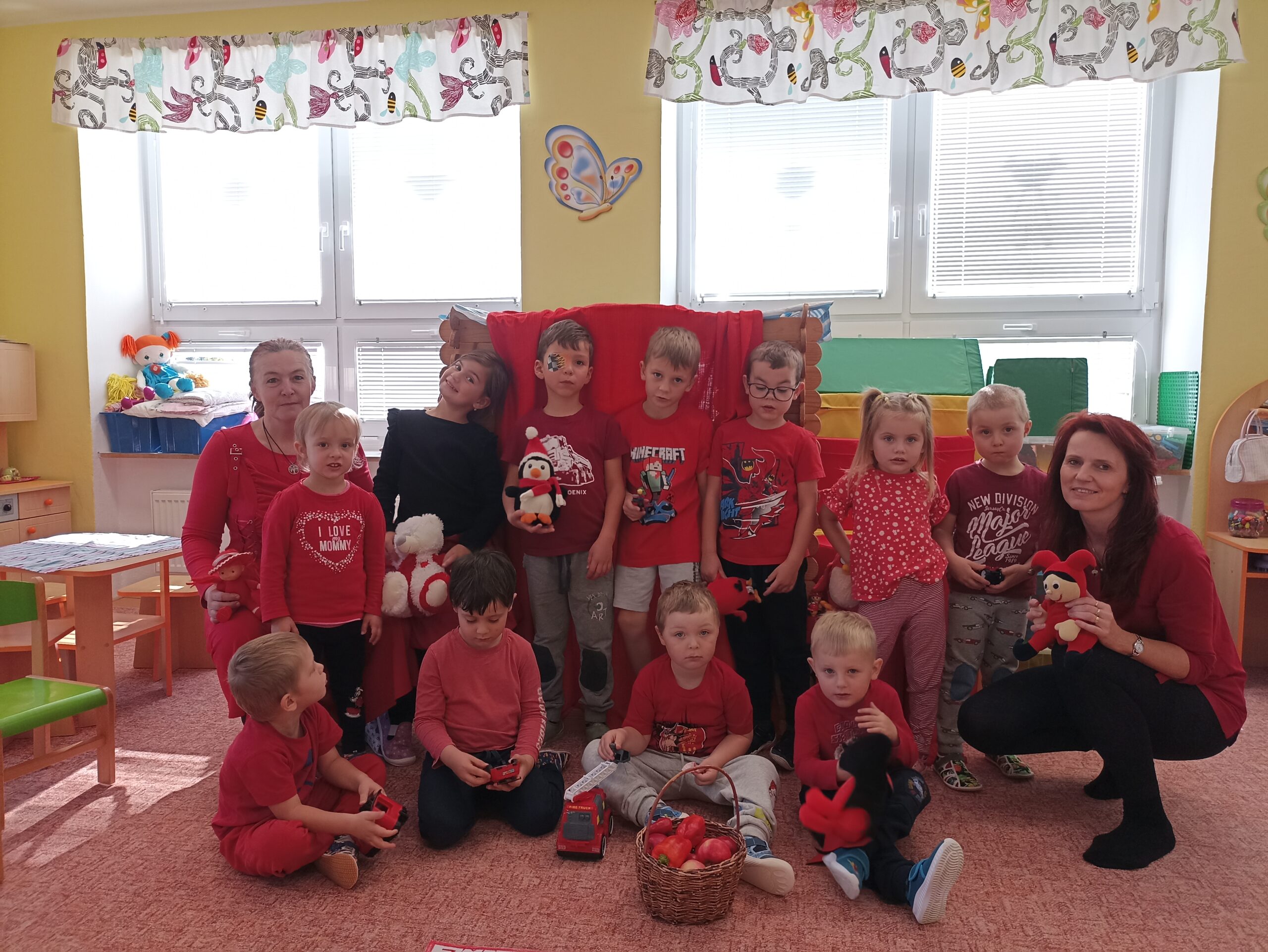 A byl tu konec září a ten nám přinesl „Červený den“. Přišli jsme oblečeni v této barvě a děti si donesly také svoji oblíbenou červenou hračku. Skřítek dětem nabídl výtvarnou činnost – tiskání červených jablíček, stavěli jsme z červených dílů různých stavebnic, hledali červené předměty ve třídě, procvičili si jemnou motoriku při hře s padákem „Koulelo se, koulelo“ a zahráli si pohádku „Červená Karkulka“, to byla legrace! Červené dobroty nás čekaly i v jídelně. Nechybělo společné foto. Děti už jsou zvědavé, jakou barvičku jim skřítek přinese na měsíc říjen. /viz. fotogalerie MŠ/